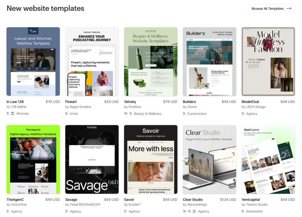 With an extensive library of templates, Webflow provides design options for virtually any type of project. From e-commerce and business sites to portfolios and blogs, each template is optimized for a specific purpose, ensuring you start with a solid foundation tailored to your needs.